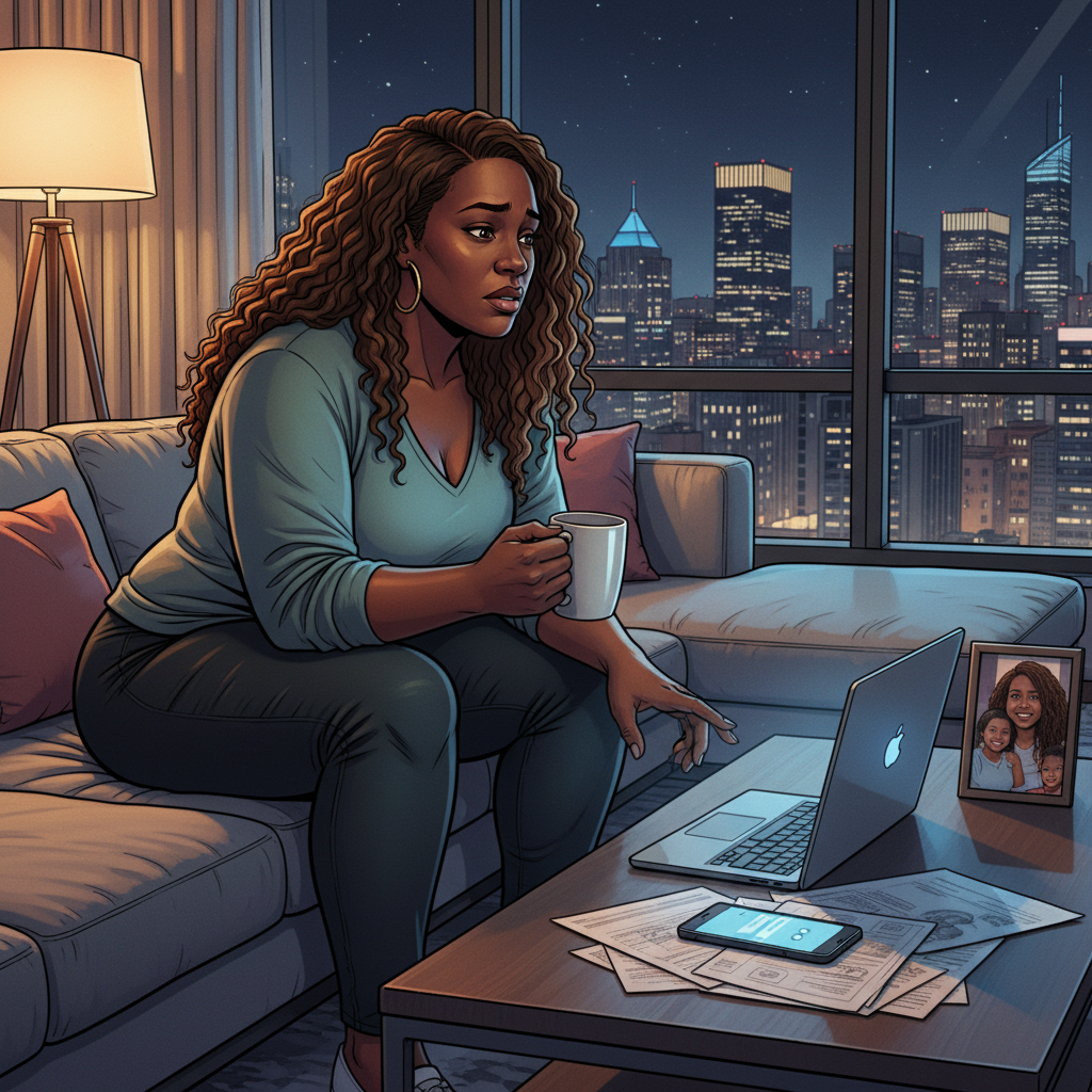 “The Weight of Doubt” — A Visual Story of Imposter Syndrome: A comic book–style illustration showing a golden balance scale. On one side, stacks of books, diplomas, and a trophy represent success. On the other side, a smaller, anxious Black woman with chocolate-brown skin and natural hair sits in a pan labeled “DOUBT.” The warm orange lighting and deep shadows highlight the emotional contrast, symbolizing how imposter syndrome makes doubt feel heavier than achievement.