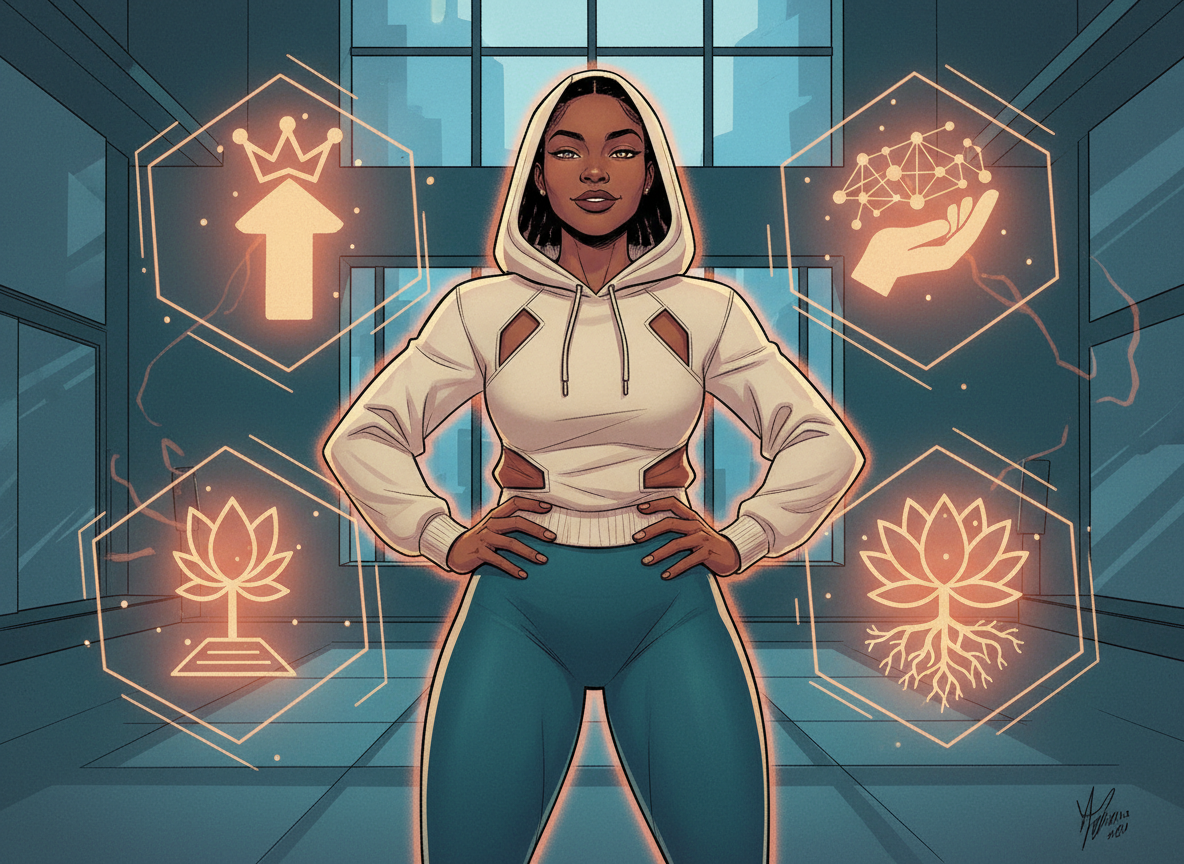 A Black woman with light honey skin tone, wearing a stylish hoodie and yoga pants, standing with powerful, confident posture. She's clearly owning her success and power without apology. Her expression shows pride, confidence, and unapologetic ownership. Her body language radiates ownership and self-possession. She's taking up space.