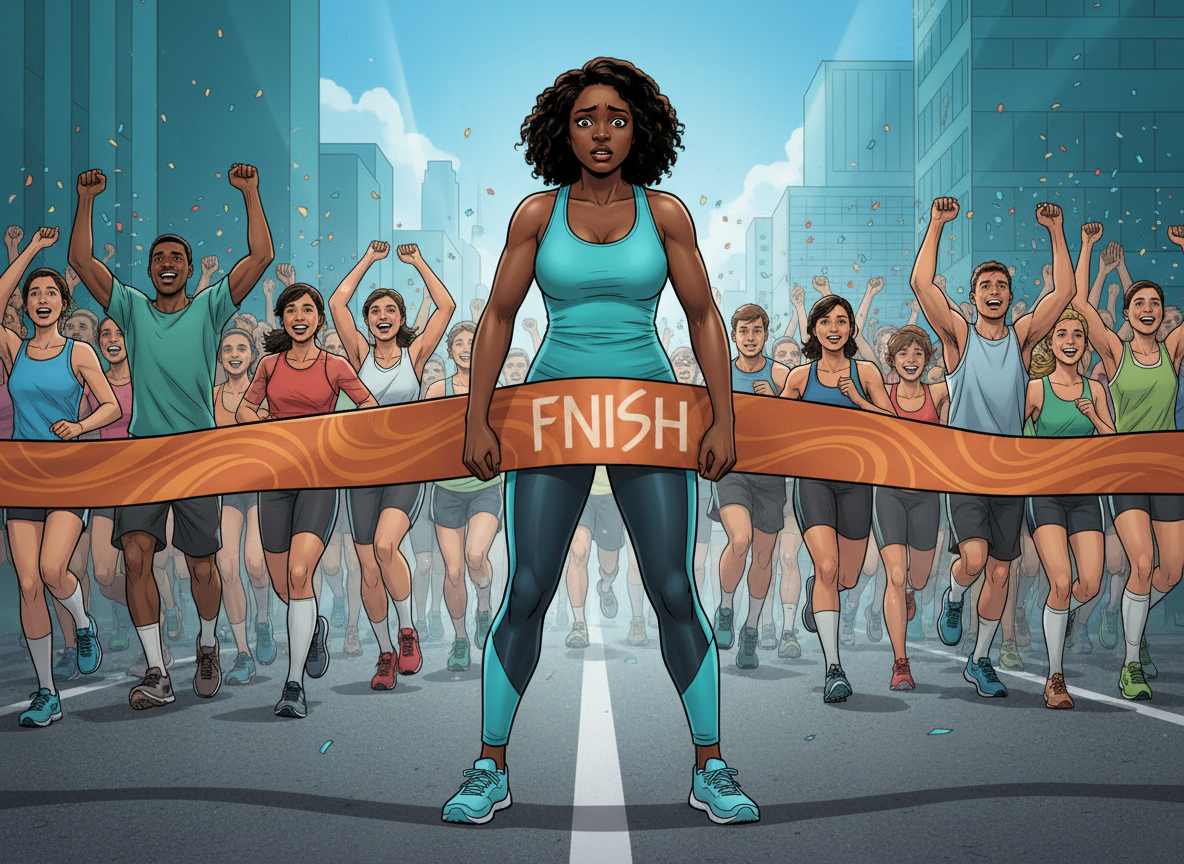 A Black woman in her early thirties with a fuller, feminine build, wearing athletic wear at a race. She's standing RIGHT AT the finish line marked. She's stopped and staring at it, frozen in fear, refusing to cross. Her facial expression shows fear and hesitation. Around her, other runners are crossing the finish line and people are cheering, but she's isolated in her moment of fear.