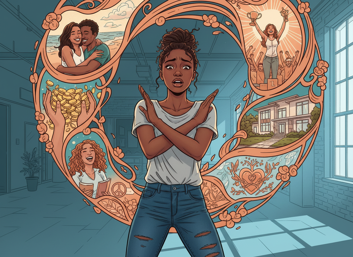 A Black woman with medium brown skin, wearing a t-shirt and ripped jeans, looking at a vision of a beautiful, successful life around her. The vision shows happiness, fulfillment, abundance, love, and achievement. But her facial expression shows she's cringing and pulling back, afraid of it. Her body language shows rejection and fear of the beautiful life she's imagining.