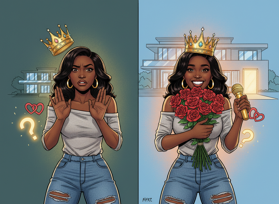 A Black woman with deep mahogany skin tone, wearing ripped jeans and an off-shoulder shirt. On the left side, she's actively pushing away symbols of success and abundance—pushing away a microphone, a crown, flowers, a bigger house, and love. Her facial expression shows rejection and fear. On the right side, she's fully embracing success with a radiant, genuine smile. She's wearing the crown on her head with pride. She's holding the flowers close to her heart. She's embracing the microphone with confidence. Her facial expression shows pure joy, fulfillment, and peace. Her eyes light up with happiness. The opportunity and bigger life are visible in the background.