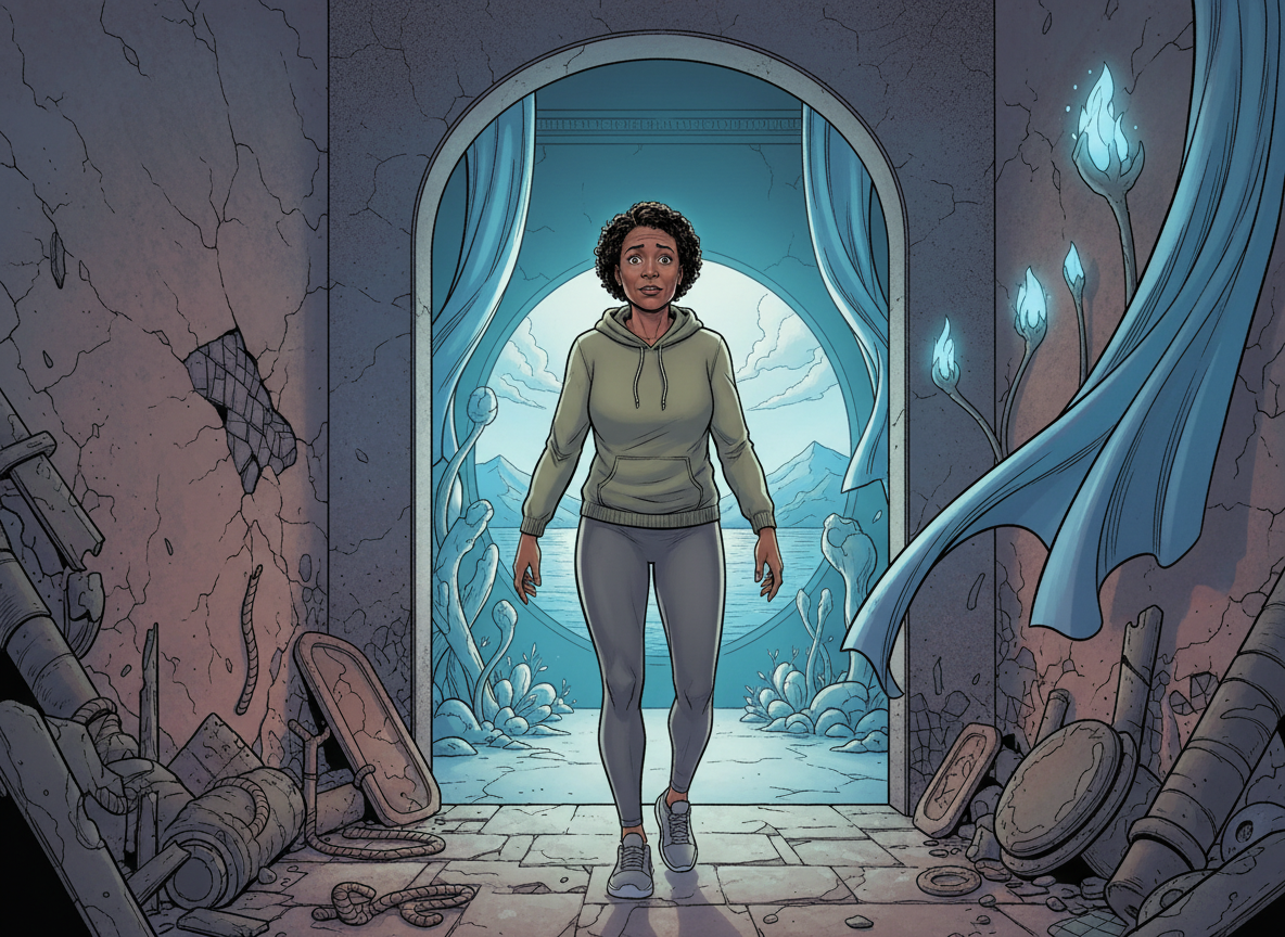A Black woman in her 50s, wearing a hoodie and comfortable leggings, moving from a smaller, dimmer space representing survival and struggle into a larger, brighter space representing thriving and ease. Her body language shows the transition—shoulders relaxing, face softening. Behind her is the struggle she's leaving. In front is ease and possibility.