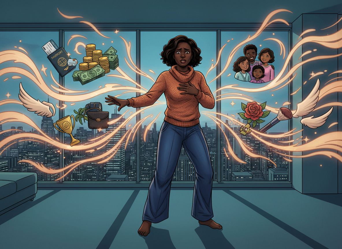 A Black woman with deep dark skin tone, wearing a cozy cowl neck sweater and comfortable pants, surrounded by symbols of 'having it all'—success, wealth, travel, family, love, career achievement, beauty, and freedom. ut her expression shows hesitation, fear, and internal conflict. She wants it but she's afraid of it. Her body language shows she's torn.
